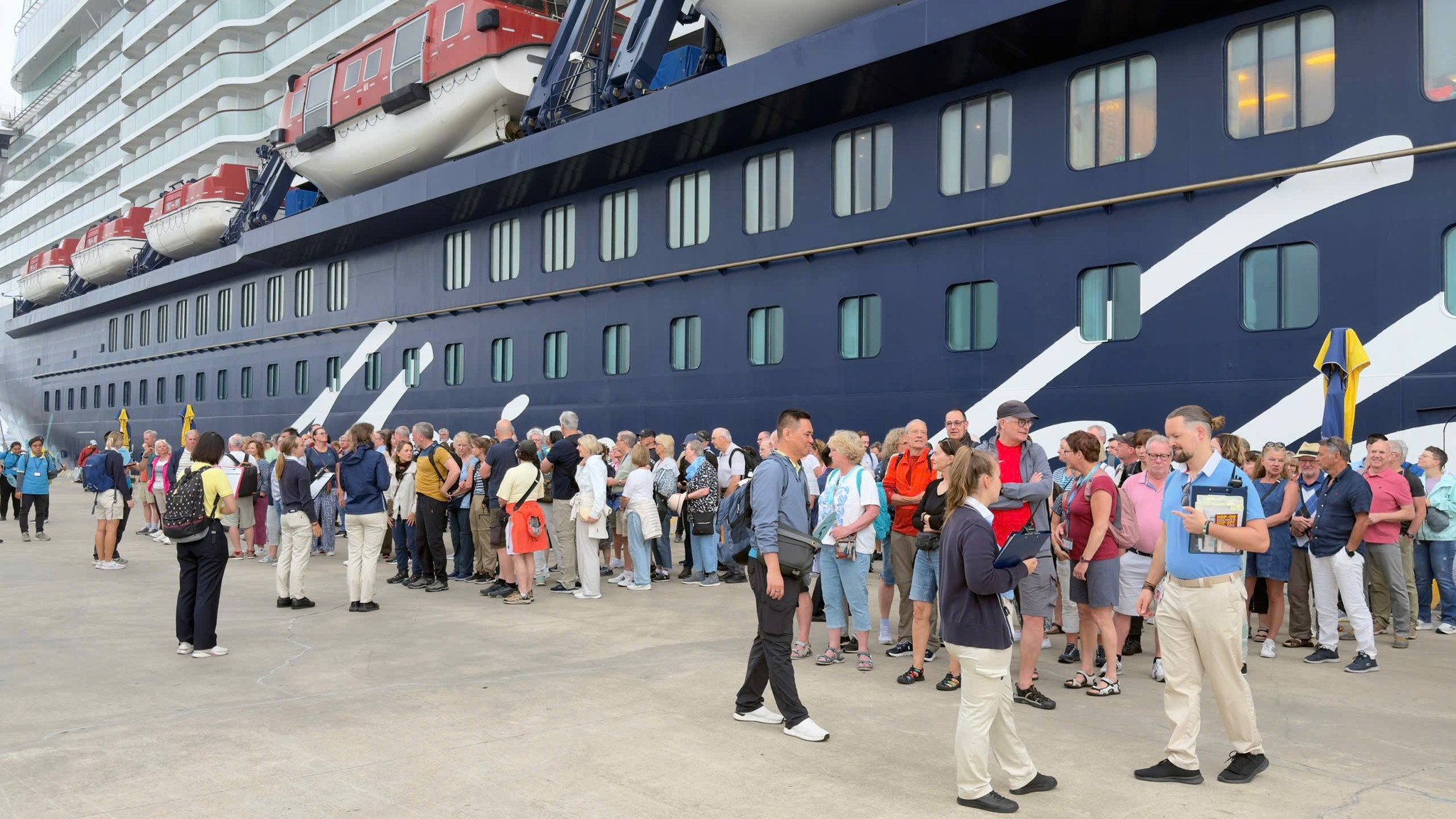 During their visit, guests are participating in curated shore excursions organized by Saigontourist Travel, offering opportunities to discover the limestone karst scenery of Ha Long Bay as well as nearby destinations including Hanoi and Hai Phong.