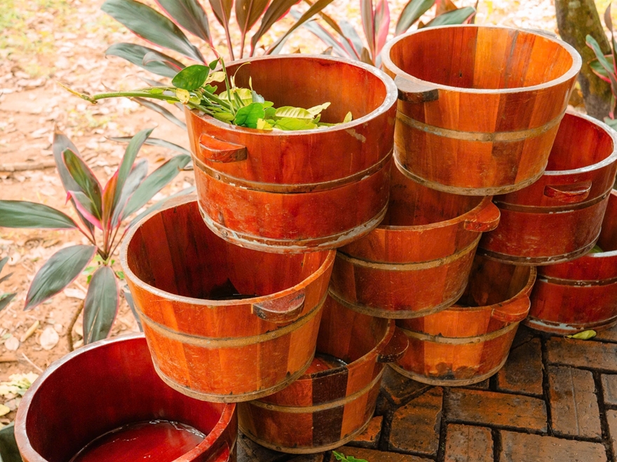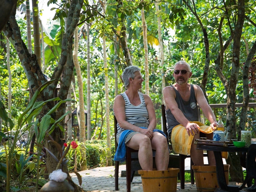 Unwind after the cycling journey with a traditional herbal foot soak and light massage, enjoyed in the open-air garden environment.