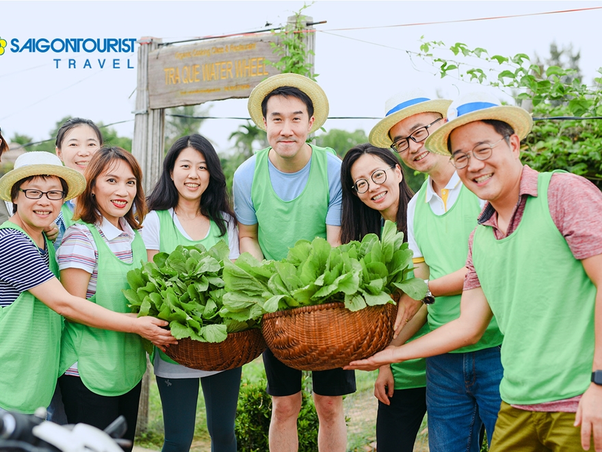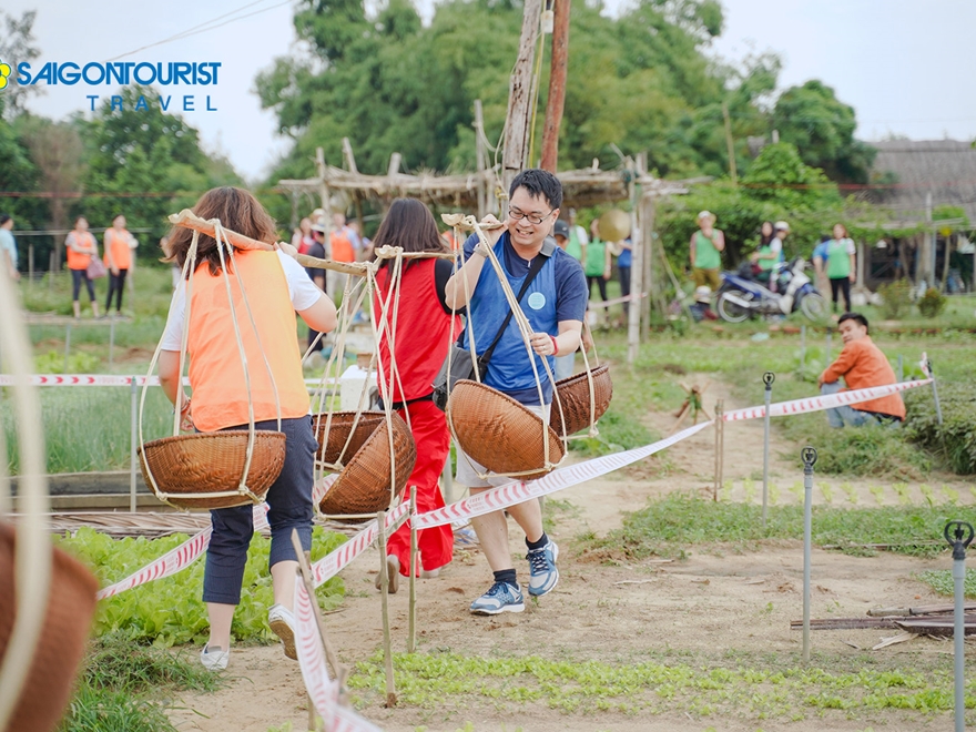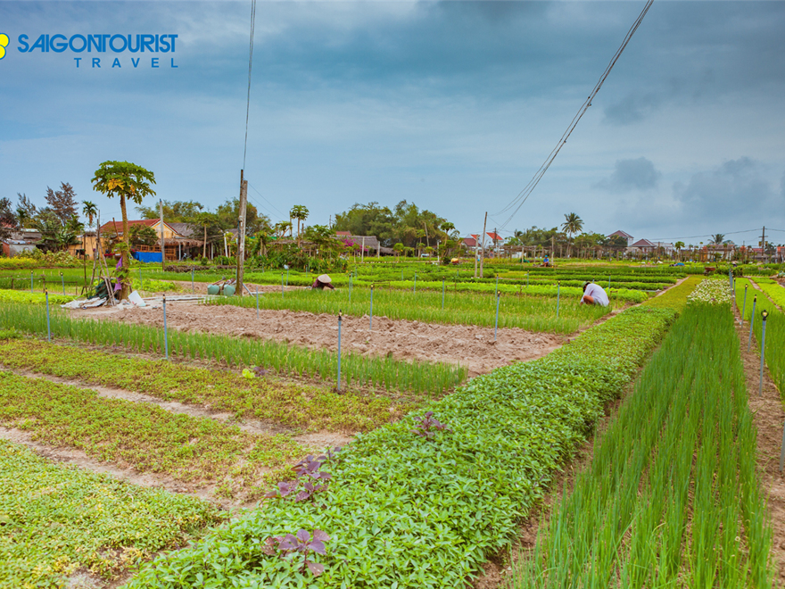 Cross the small streets by car or bicycle. • Leisurely cycle on village roads through the fields towards Tra Que vegetable village. • Join the farmers in preparing the land and fertilizing it with seaweed from the local lake. The next steps include: raking the ground, sowing seeds, watering, picking vegetables, and other gardening activities.